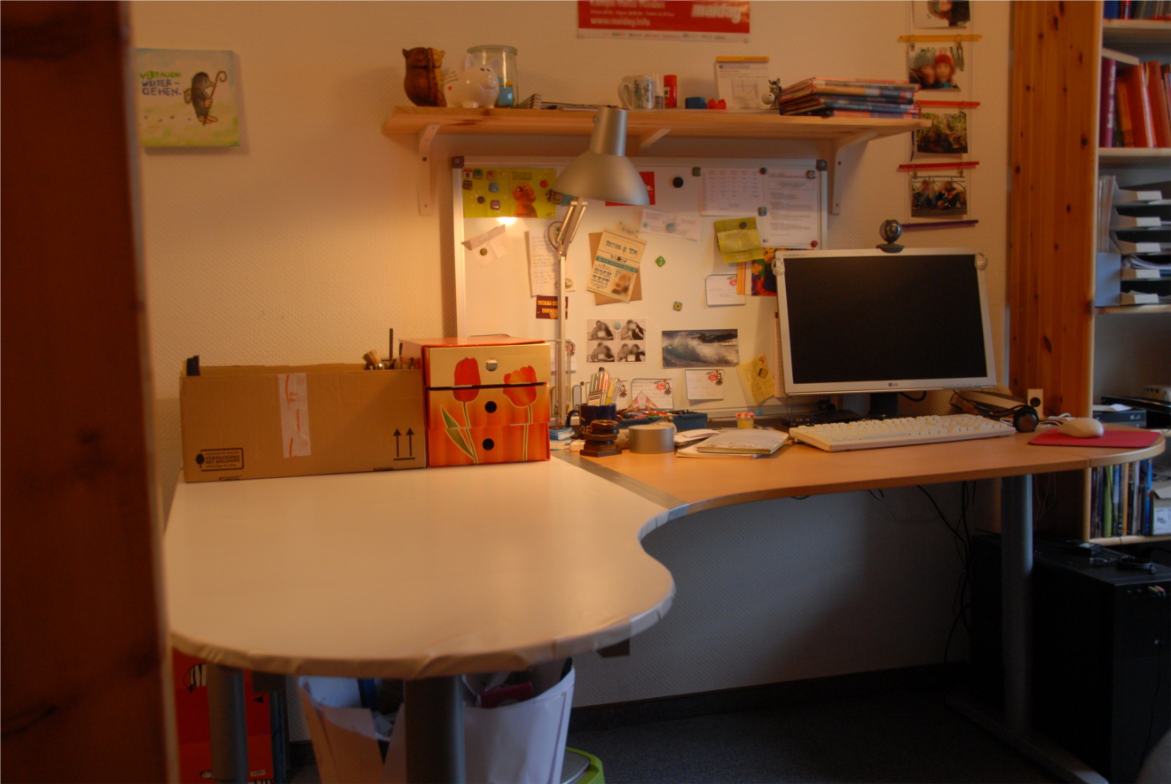 Ich habe mir gestern einen Traum erfüllt – malen können in meinem Zimmer. Ich habe mir eine Wachsdecke (für 5€) gekauft, diese mit Panzerband (nach guter, alter Sola-manier) an meinem Tisch festgeklebt und habe die Farben in mein Zimmer geholt. Endlich malen, wann ich will und ohne ständig genervt zu werden! „Oh, du malst… Was soll das werden? Orr, sag mal! Was soll das werden? Du kannst mich nicht raus schicken, das ist nicht dein Zimmer!“ „Naja, aber du musst dann auch bald aufräumen, es gibt dann Abendessen!“ – Nie wieder!
